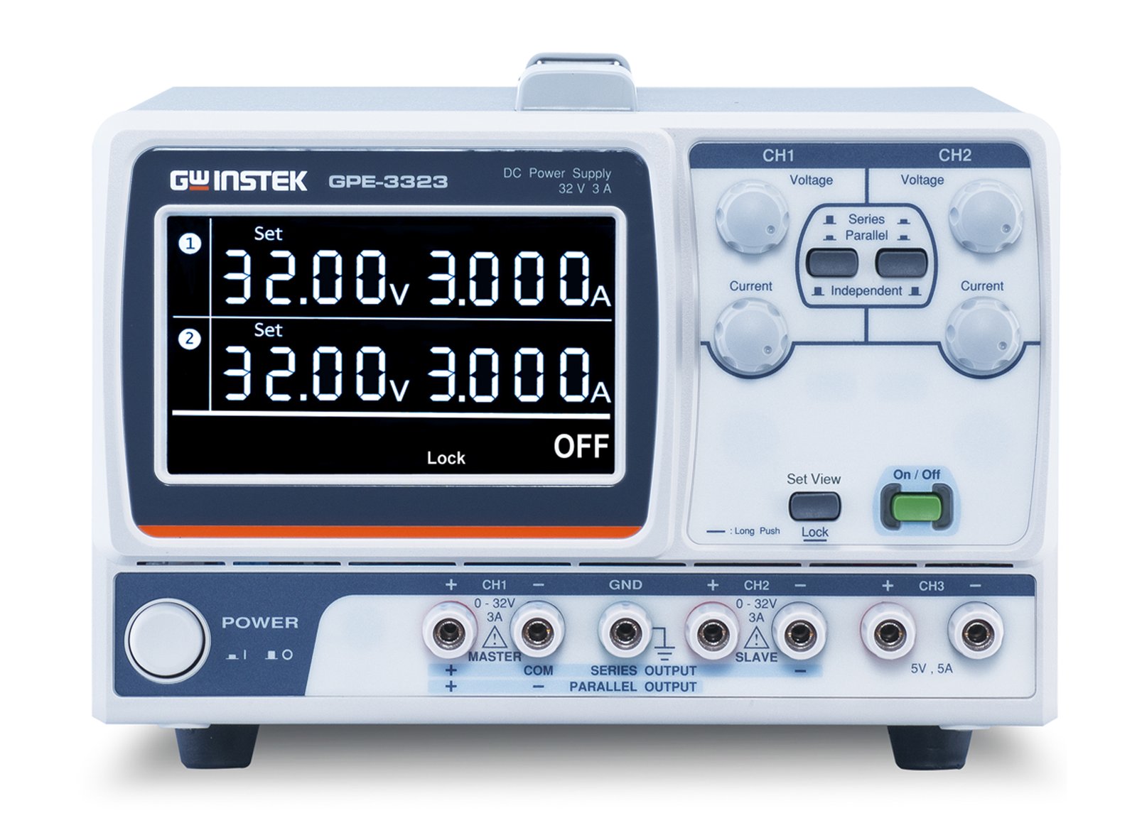 GW INSTEK GPE-X323A series refines precision with an encoder switch for more accurate voltage and current adjustments. Additionally, the digital control system has been streamlined, reducing six rotary knobs to just two and enhancing the front panel’s simplicity and ease of operation.