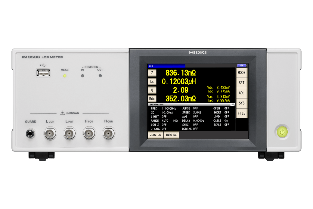 HIOKI LCR Meters and Impedance Analyzers range from 1mHz to 3GHz devices to suit a wide range of applications in the testing of electronic components. The IM3536 raises the industry standard for general-purpose LCR meters by offering a wide DC and 4 Hz to 8 MHz testing frequency while delivering 0.05% accuracy, ideal for evaluating the characteristics of next generation electronic components, including power supply inductors thanks to the instrument’s maximum measurement frequency of 8 MHz
